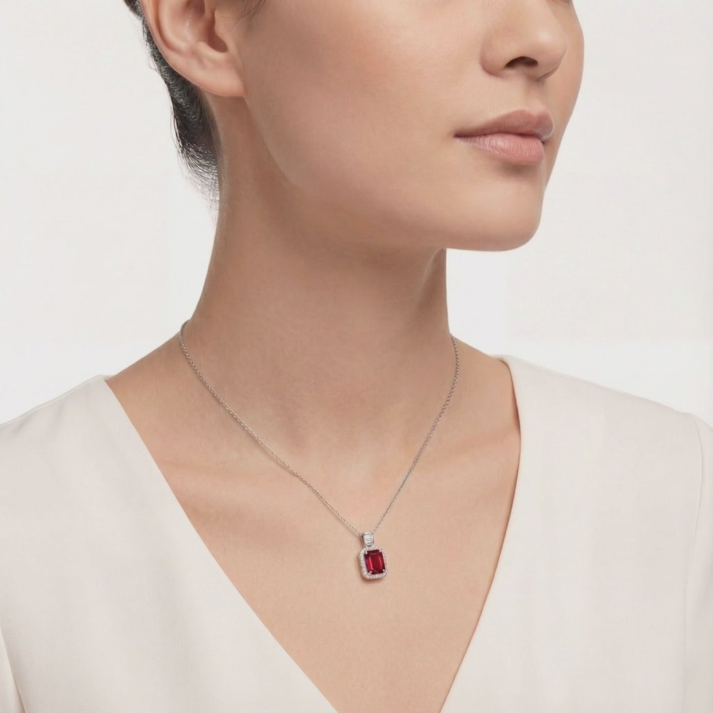 Mined rubies are often cloudy, heavily included, and inconsistent in color. We engineered the solution. This necklace features a Simulated Ruby color-calibrated to the iconic "Pigeon Blood" red benchmark. Every facet is precision-cut from A5 Grade material to ensure the intense fire and deep saturation that nature rarely delivers.