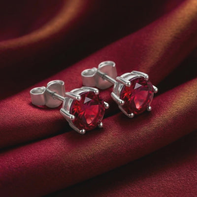 Mined rubies are notorious for internal cracks and brown undertones. We engineered a better way. These stud earrings feature Simulated Ruby, color-calibrated to match the rare "Pigeon Blood" red benchmark. Every stone is precision-cut from A5-grade material to ensure maximum light return and intense fire.