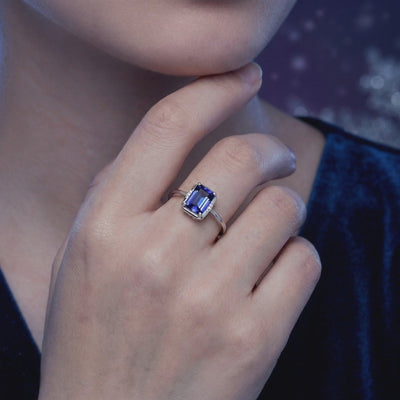 - Center Stone: 6x8mm Emerald-Cut Simulated Tanzanite (A5 Grade Zirconia).