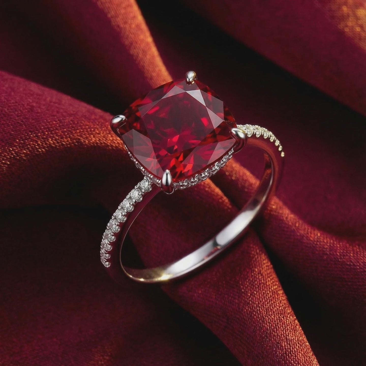 - Center Stone: 10x10mm Cushion-Cut Simulated Ruby (A5 Grade Zirconia).