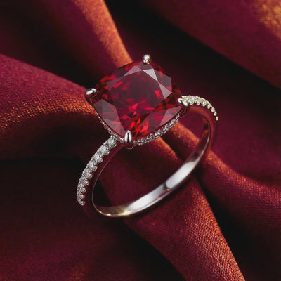 Mined rubies are notoriously inconsistent, often appearing cloudy or containing visible inclusions. This cushion-cut ring features a Simulated Ruby, engineered to match the elite “Pigeon Blood” red standard. Precision-cut from A5 Grade material, it ensures perfect light return and deep saturation that nature rarely achieves consistently.