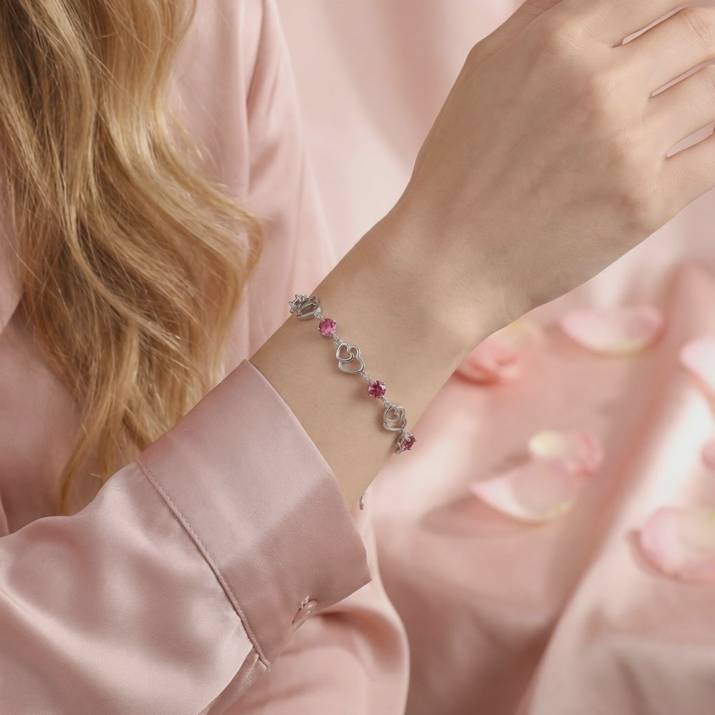 Nature rarely delivers consistency. Mined pink tourmalines are often cloudy or uneven in tone. The Lucerienne heart bracelet features high-performance Simulated Pink Tourmaline, color-calibrated to achieve a vivid raspberry brilliance and exceptional clarity that rivals museum-grade gems. Each stone is precision-cut to maximize light return and fire.