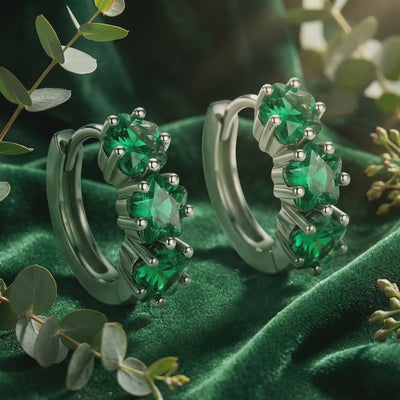 Mined emeralds are notoriously brittle and filled with internal inclusions that compromise their beauty. We engineered a better way. These huggie earrings feature three star-cut Simulated Emeralds, color-calibrated to match the deep forest green benchmark of the world's finest stones without the structural flaws.