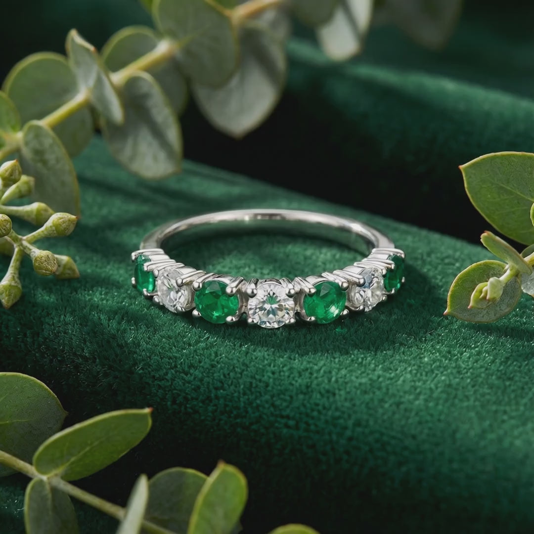 This half-eternity ring features seven round-cut stones set in a low-profile mounting designed for daily durability. It won't snag on knitwear or catch during your workday. Set in Solid 925 Sterling Silver and finished with a heavy layer of Rhodium (part of the Platinum family) to resist tarnish and maintain a mirror-like shine through hand washing and daily wear.