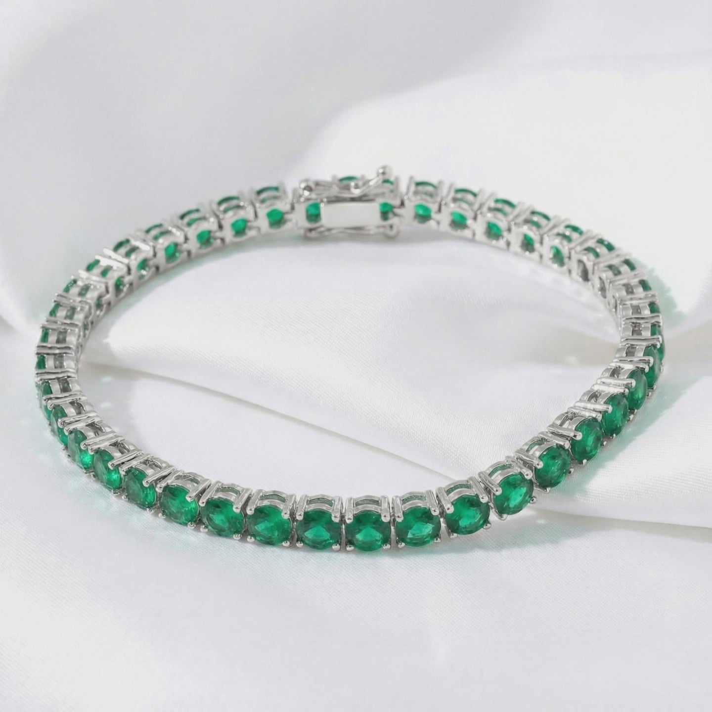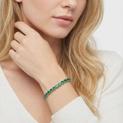 Mined emeralds are notoriously brittle and often filled with cloud-like inclusions. This May birthstone bracelet features Simulated Emeralds, color-calibrated to achieve the ideal "forest green" saturation with VVS-grade clarity. Each stone is precision-cut for maximum light return, ensuring a consistent sparkle that nature rarely provides.